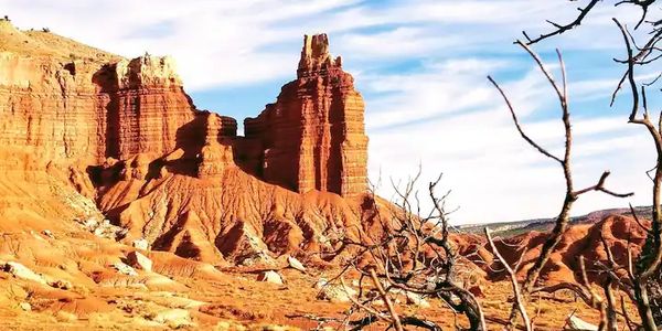 Capitol Reef National Park is in Utah's south-central desert. It surrounds a long wrinkle in the earth known as the Waterpocket Fold, with layers of golden sandstone, canyons and striking rock formations. Among the park's sights are the Chimney Rock pillar, the Hickman Bridge arch, and Capitol Reef, known for its white sandstone domes. In the north are the towering monoliths of Cathedral Valley.